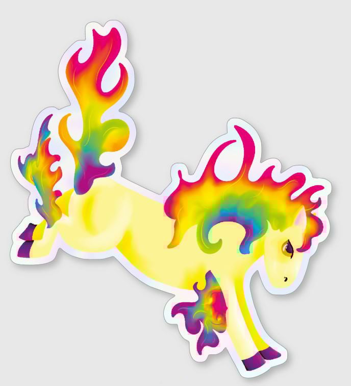 Holographic sticker of a rainbow flamed Ponyta, bucking. Measures approx. 2.7" x 3"