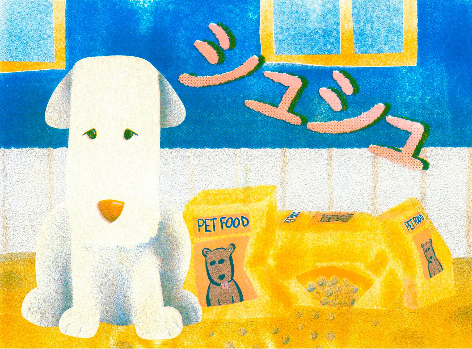 Inspired by the East Blue, three color (sunflower, fluorescent orange, medium blue) Risograph print shows Chou-Chou with his many bags of pet food. Features his name in Japanese. Run of 35 prints, individually signed and numbered in pencil.